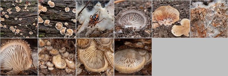 Auricularia auricula-judae, Heliocybe sulcata, Hohenbuehelia cyphelliformis, Laccaria bicolor, Lentinus arcularius, Phellinus gilvus, Stereum complicatum, Tremella mesenterica